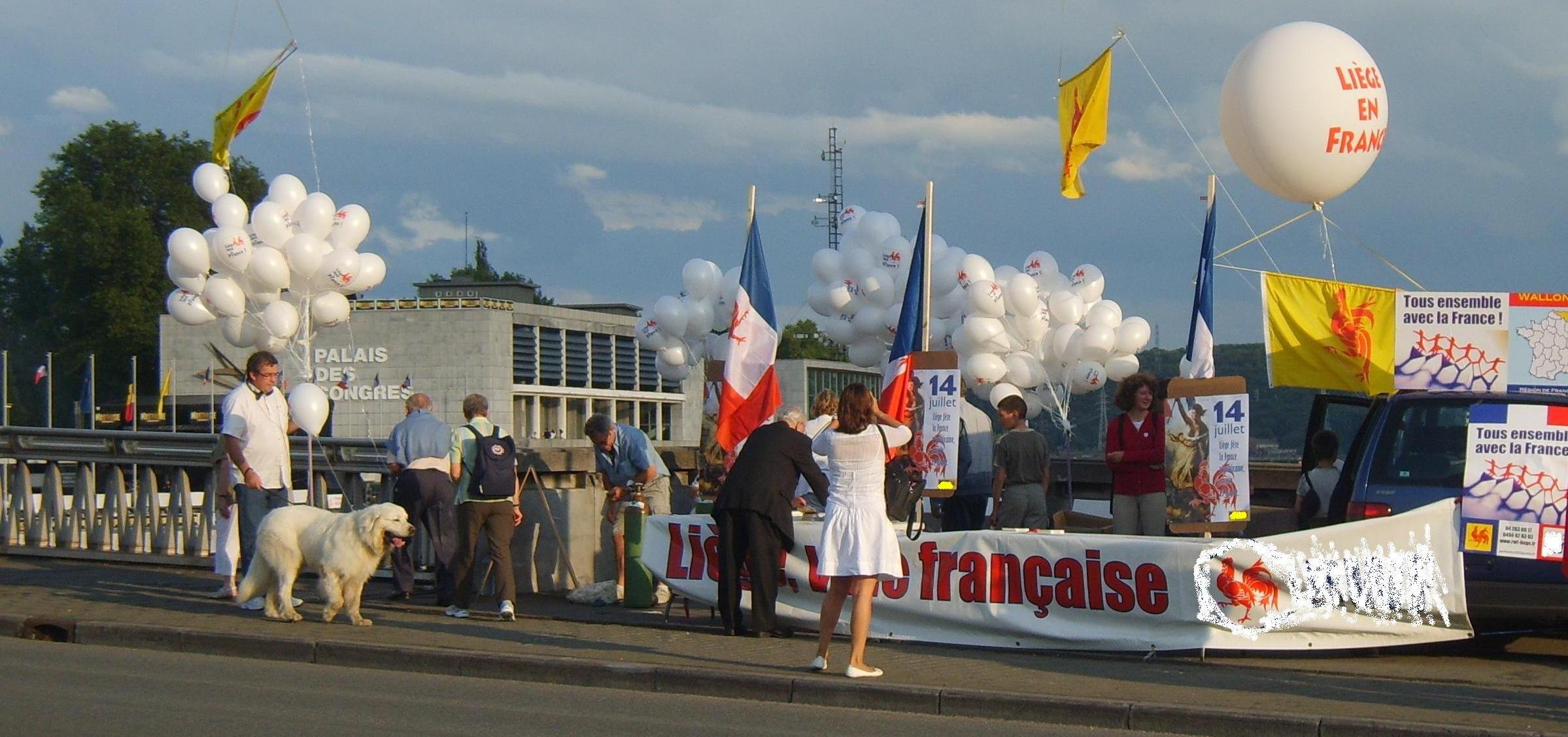 Nous savons que la présence de rattachistes aux festivités du 14 juillet à Liège est parfois mal accueillie. Soucieux de ne pas jouer les trouble-fête, nous avons progressivement abandonné tout ce qui pouvait ressembler à une exploitation politique d’un événement dont nous ne sommes pas les organisateurs. En 2009, les ballons que nous avons distribués au public, ne portaient aucune référence à un parti politique.