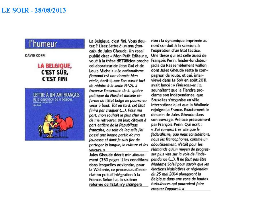 Pour ceux qui n’ont pas renoncé à leur tête, il reste les écrits de ces historiens, sans doute trop wallons pour être honnêtes, qui ont dénoncé la façon très partiale dont l’histoire de Belgique était enseignée avant… ou peut-être encore maintenant. Pour construire une identité nouvelle, il fallait passer par là, bien sûr. Mais nous sommes en 2013, la Belgique unitaire est devenue une fiction, la Wallonie doit prendre en main son destin et Le Vif/L’Express soupçonne l’Institut Jules Destrée d’avoir une démarche militante en travaillant sur l’histoire du Mouvement wallon. Philippe Destatte, son directeur, s’en défend (et nous savons à quel point la rigueur scientifique est pointilleuse à l’Institut Destrée), mais admettons que la mise en évidence d’un combat wallon, doublée d’une réflexion sur l’identité wallonne, constitue en soi une démarche militante… et une démarche indispensable pour s’arracher au roman national belge.