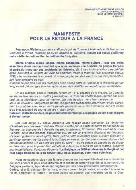 Cela ne doit pas nous empêcher de vous faire part d’écrits ou de paroles de candidats qui osent s’aventurer sur le terrain de la Belgique française. Cela nous change du couplet diplomatique du Quai d’Orsay qui concerne notre avenir : « ni ingérence, ni indifférence ».