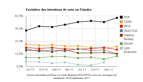 Le danger de récupération partisane et populiste d’une éventuel retard pris dans la mise en oeuvre effective de la réforme de l’État est, à mon sens, à prendre d’autant plus au sérieux que de récents sondages d’opinion, effectués notamment par Le Soir d’une part et La Libre Belgique de l’autre, démontrent que, côté flamand, la NVA recueille actuellement environ 35 pourcent des intentions de vote et que le Vlaams Belang est crédité de 11 pour-cent4. Au total, ces deux partis flamands (qui, comme nous le savons, sont explicitement en faveur d’une partition du pays) recueillent donc actuellement 46 pour-cent des intentions de vote au sein du corps électoral flamand.